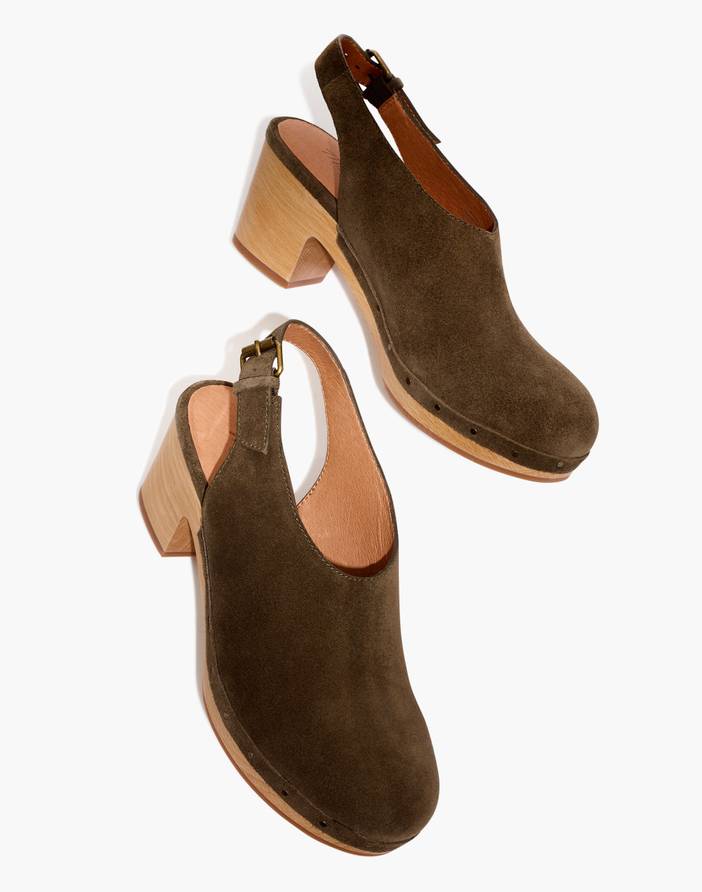 Made of supple suede, these chunky clogs have old-school wooden soles and an adjustable back strap to reduce the clomp-clomps just a smidge. Perfect for showing off some cute socks when it's chilly out. Cushiness alert: We've added an extra layer of padding to make them even easier on the feet. When you select your size, "H" equals a half size.2 1/2" heel.Suede upper.Man-made sole.Import.Madewell.com only.