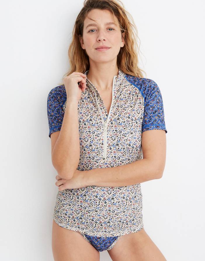 Our Madewell Second Wave swim collection has a built-in feel-good factor—the fabric was made using recycled plastic. Complete with a cool mix of '70s florals, this short-sleeve rash guard provides sunscreen-boosting UPF 50 protection. UPF 50 sun protection.Recycled polyamide/elastane.Do Well: This fabric is recycled from post-consumer waste like water bottles.Our swimsuits are machine washable, but we recommend hand washing as it helps keep the fabric and the shape of the suit looking newer, longer.Import.Madewell.com only.