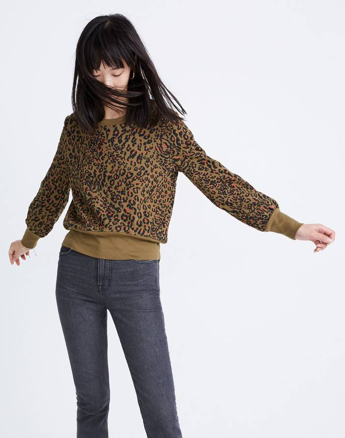 With a slightly shrunken retro fit and a flattering banded waist, this leopard-print crewneck sweatshirt is a perfectly laid-back sweater substitute. Regular fit.Cotton/poly.Machine wash.Import.Select stores.