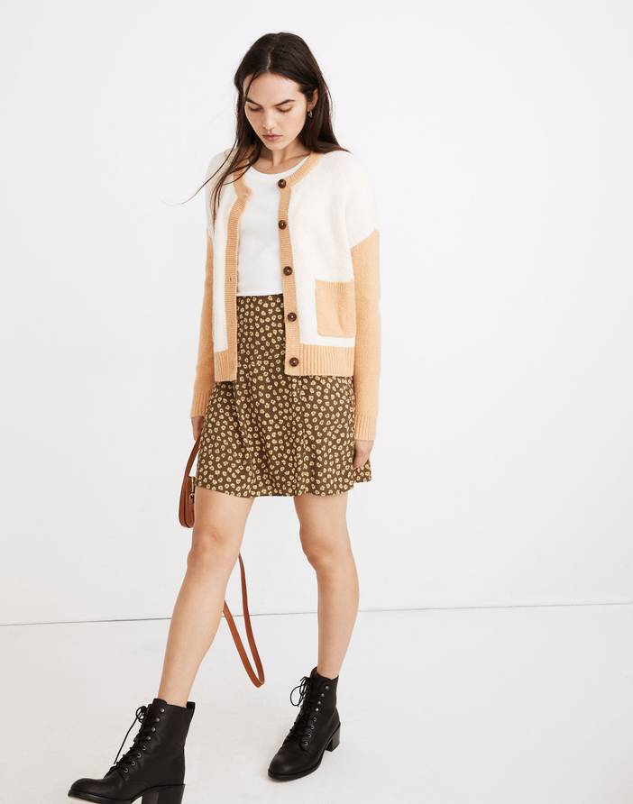 Knit from a textural new version of our signature Coziest Yarn, this colorblock cardigan sweater is so soft that you can wear it as a top (try it with a couple of buttons undone). Boxy and cropped, it has patch pockets. Slightly cropped, boxy fit.Body length from high point of shoulder: 20 1/2" (based on size M).Do Well: We partner with the Better Cotton Initiative to improve cotton farming globally.Cotton/polyamide/merino wool/elastane.Machine wash.Import.