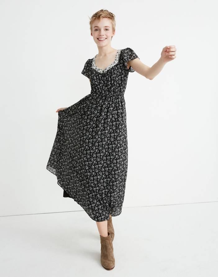 With romantic puffed sleeves, retro covered buttons and a mix of floral prints, this seriously pretty georgette midi dress is one you'll want to hold onto for a looong time. Falls 50" from high point of shoulder (based on size 6).Poly.Lined.Machine wash.Import.Madewell.com only.