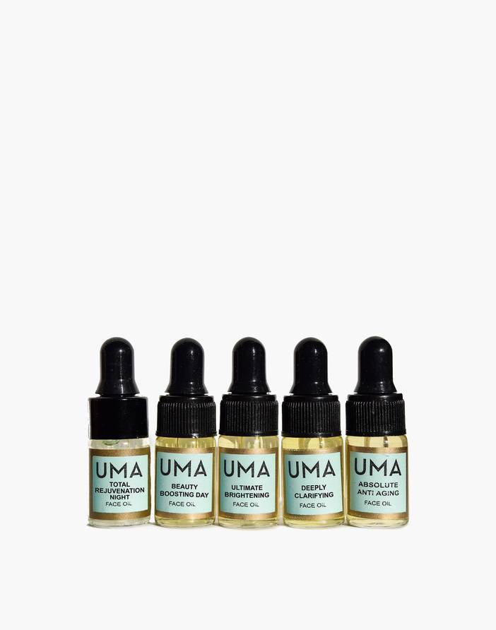 What's in our Beauty Cabinet? Tried-and-true products, curated by us, that fall in the sweet spot between low maintenance and treat yourself. Based on age-old principles (the founder is descended from a long line of Ayurvedic healers), UMA specializes in botanical blends crafted in India of local ingredients. This giftable travel-friendly sampler set includes all five face oils. Shop more UMA items. Includes Absolute Anti-Aging Face Oil, 3 mL; Ultimate Brightening Face Oil, 3 mL; Total Rejuvenation Night Face Oil, 3mL; Beauty Boosting Day Face Oil, 3 mL and Deeply Clarifying Face Oil, 3 mL.Import.