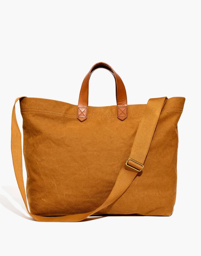 Made of 100 percent cotton canvas and trimmed with a signature guitar trap-inspired taping, it's sturdy enough to hold all your daily essentials. Canvas, leather straps.4 1/2" handle drop.19 1/2" strap drop.12 1/2"H x 14 1/2"W (at base), 19"W (at top) x 5 3/4"D.Import.