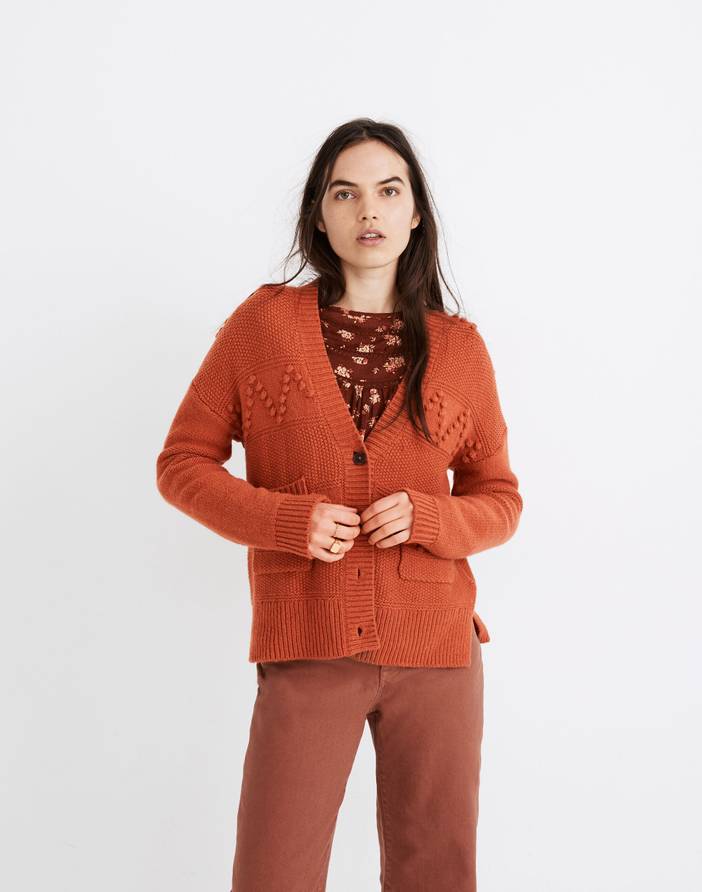 As far as we're concerned, bobbles are the best. This versatile cardigan sweater has 'em in a playful zigzag pattern, plus, it's boxy and cropped to pair perfectly with jeans. Slightly cropped, boxy fit.Body length from high point of shoulder: 22" (based on size M).Polyamide/merino wool/poly/alpaca.Hand wash.Import.