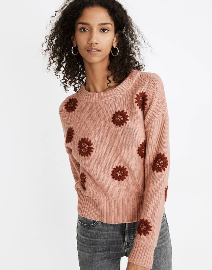 Future keepsake alert: This supersoft little crewneck sweater is hand embroidered with little flowers. Cropped fit.Body length from high point of shoulder: 22 1/2" (based on size M).Polyamide/merino wool/poly/alpaca.Dry clean.Import.