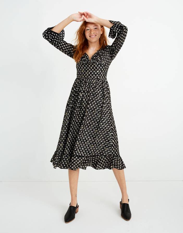 Copenhagen-based Stine Goya started out as a model and fashion editor before turning her highly-developed aesthetic eye to her own designs. Inspired by the art world, she's known for wearable pieces like this V-neck dress with flounce details and an allover star print. Waisted.Falls 46 3/4" from high point of shoulder.Poly.Hand wash.Import.Madewell.com only.