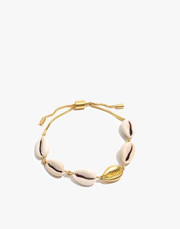 The cowrie bracelet you wish you'd found on vacation. This beauty has a pretty gold-plated brass shell mixed in with the real thing on a fully adjustable (!) box chain. Length: 10".Gold-plated brass, shell, cubic zirconia.Sliding closure.Clean your jewelry after each wearing with a soft cloth.Import.