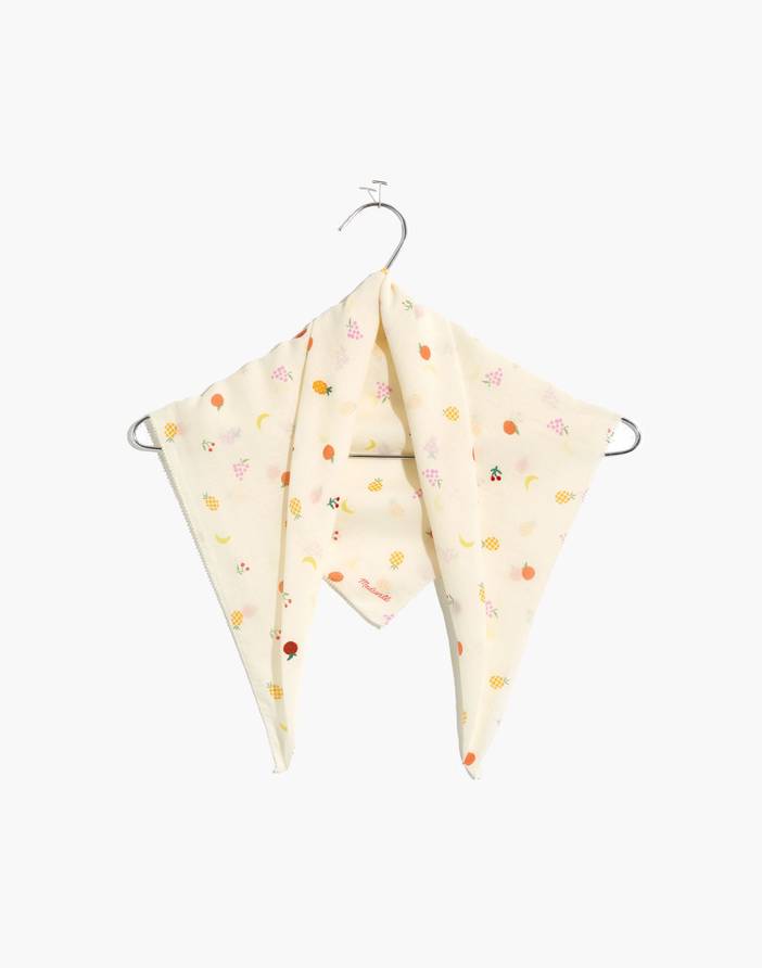 Made of organic cotton in a cheerful fruit print (bonus: some of them are embroidered), this bandana is edged in delicate zigzag trim. Wear it as a kerchief, tie it onto a tote, wrap it around your wrist... Trust us, you'll never tire of ways to style it. 21 1/2"L X 21 1/2"W.Organic cotton.Machine wash.Import.