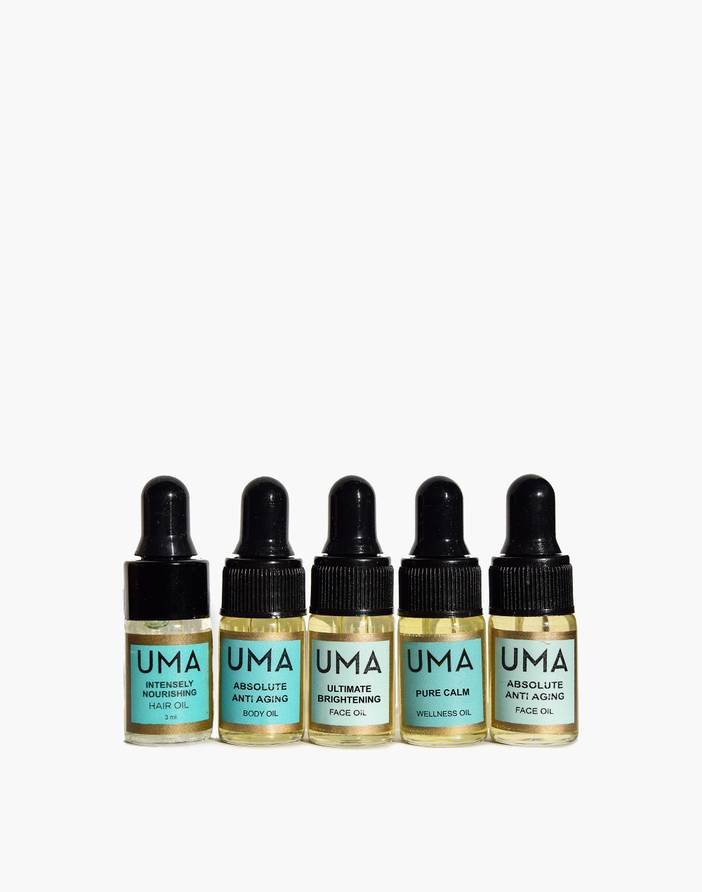 What's in our Beauty Cabinet? Tried-and-true products, curated by us, that fall in the sweet spot between low maintenance and treat yourself. Based on age-old principles (the founder is descended from a long line of Ayurvedic healers), UMA specializes in botanical blends crafted in India of local ingredients. This discovery kit includes travel-friendly samples of their best-selling oils for skin and hair. Shop more UMA items. Includes Absolute Anti-Aging Face Oil, 3 mL; Ultimate Brightening Face Oil, 3 mL; Intensely Nourishing Hair Oil, 3 mL; Absolute Anti-Aging Body Oil, 3 mL and Pure Calm Wellness Oil, 3 mL.Import.