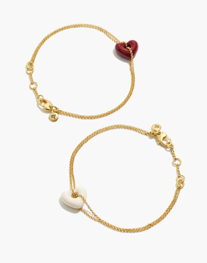 One for you, one for the person who always answers your FaceTime. Made using gold-plated brass chains, these chunky heart friendship bracelets are more grown-up than the ones you had in junior high but just as fun. Fully adjustable, they are the perfect gift for distanced BFFs. Length: 6 3/4" with a 1" extender chain for adjustable length.Gold-plated recycled brass, epoxy, cubic zirconia.Spring clasp closure.Clean your jewelry after each wearing with a soft cloth.Import.Select stores.