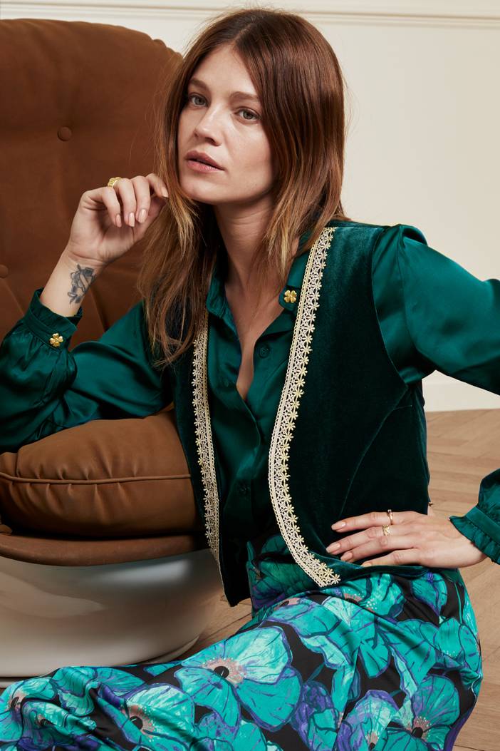 Velvet gilet with gold-coloured lace details. Giulia Gilet has inner lining in the Dalmatian print.