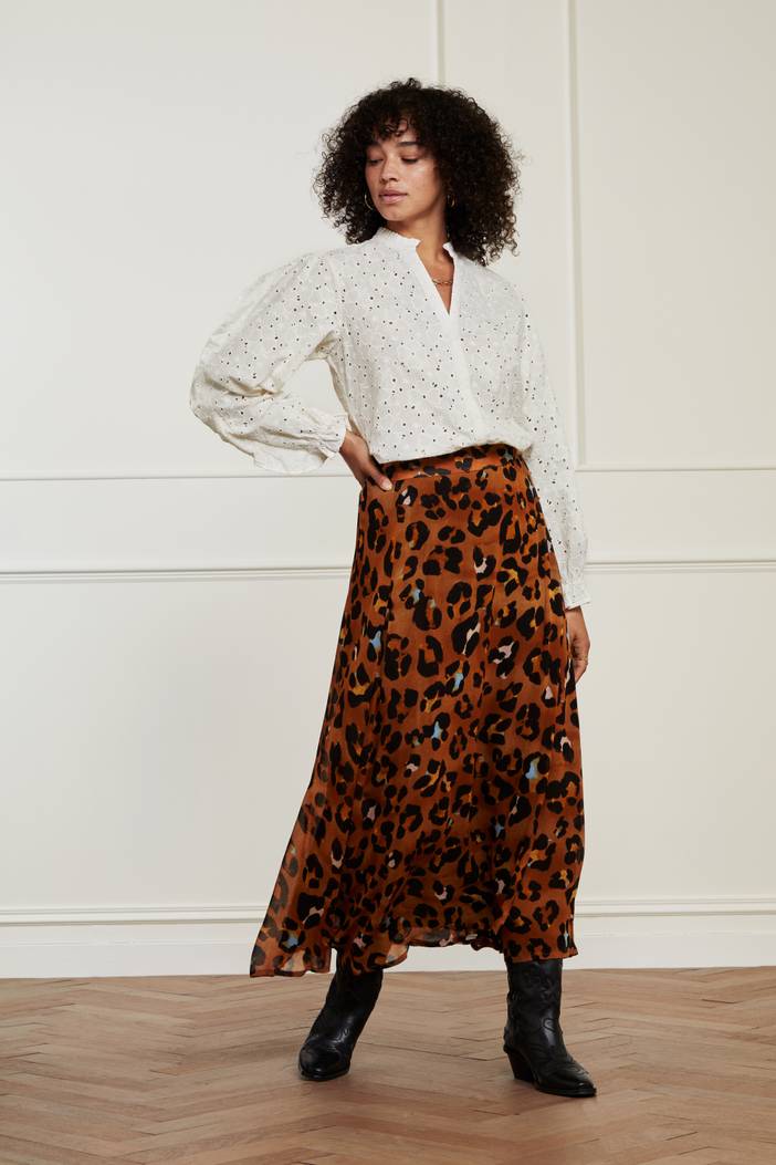 A-line wrap skirt with a tie at the waist. Bobo Skirt has an all-over 'Leopatra' print.