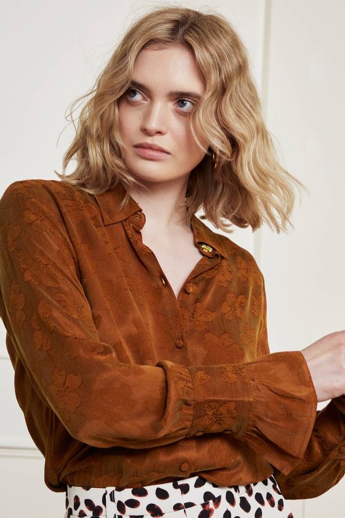 Blouse with button closure, classic collar and fabric covered buttons on the cuffs. Philia Tess Blouse is made of a beautiful jacquard cupro fabric.