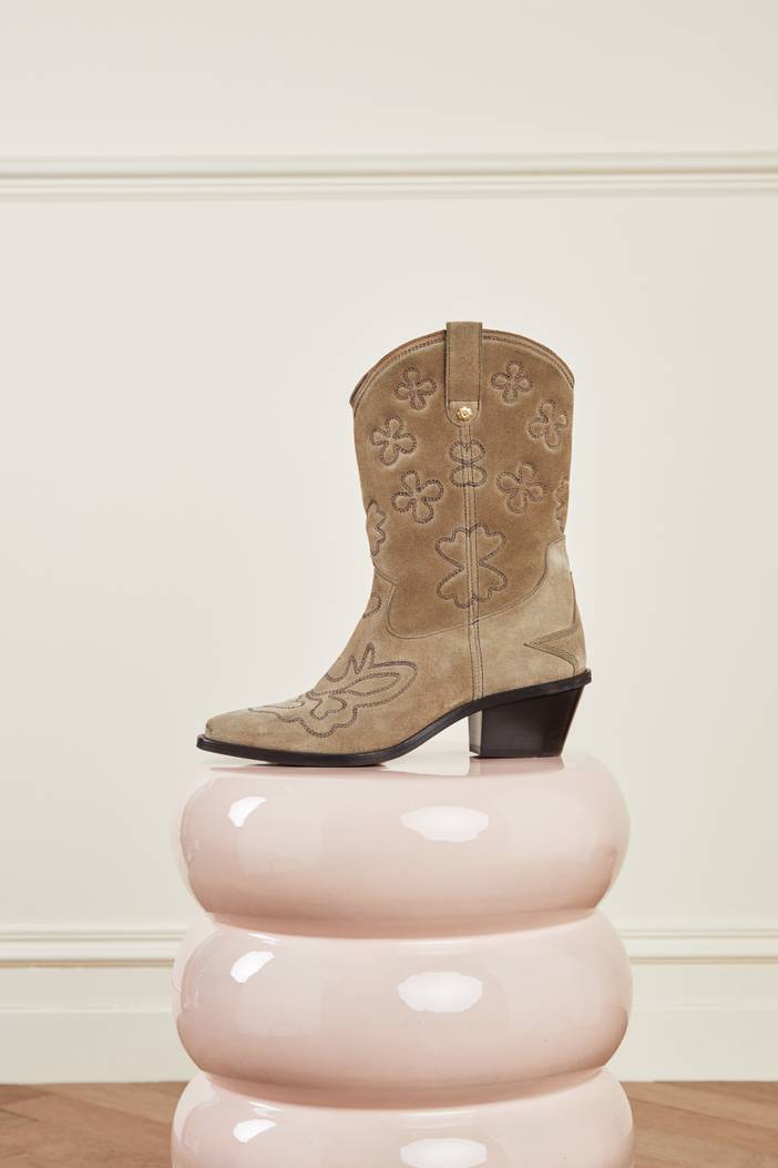 Mid-high leather cowboy boot with square toe. Jolly Mid High Embroidery Boot has a low, sturdy heel and stitched details.