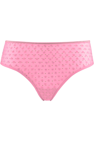 Volg je hart, of nog beter: volg de schattige hartjes van dit roze brazilian slipje! Het ultra flatterende ontwerp is gedrapeerd in een doorschijnend fijn gaas en versierd met kleine gouden stippen en een flockprint met schattige hartjes. Deze trendy vorm bedekt je heupen en liezen, terwijl je buik en het onderste deel van de billen vrij blijven. Deze roze slip is afgewerkt met glinsterende gouden lurex langs de randen voor een luxe touch. Omarm je innerlijke liefdesgodin in deze sexy roze slip.