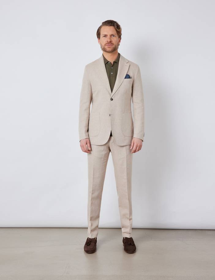 This exquisite stone slim fit suit jacket is made in Italy from a luxurious cotton linen blend. The lined, single breasted jacket is designed with a classic notch lapel with two front buttons. The elegant double vents enable freedom of movement. These exquisite stone cotton linen suit trousers feature a slim fit and a tapered leg for a modern look. To ensure the best fit, these trousers are unfinished and require alteration. This allows you to have your trousers tailored to the precise length you require. Bring your trousers to any of our stores for free alterations. . 50% Cotton and 50% LinenThe model is wearing a size 38 jacket and size 32 trousersModel is 6'1"/ 187cm tall, with a 40" / 101. 5cm chest and a 34" /86. 5cm waist. Returns Policy: For online purchases, Hawes & Curtis operates a 30 day returns policy on all suits, subject to them being returned in their original condition. Hawes & Curtis Men's Italian Cotton Linen Slim Fit Suit in Stone | 1913 Collection
