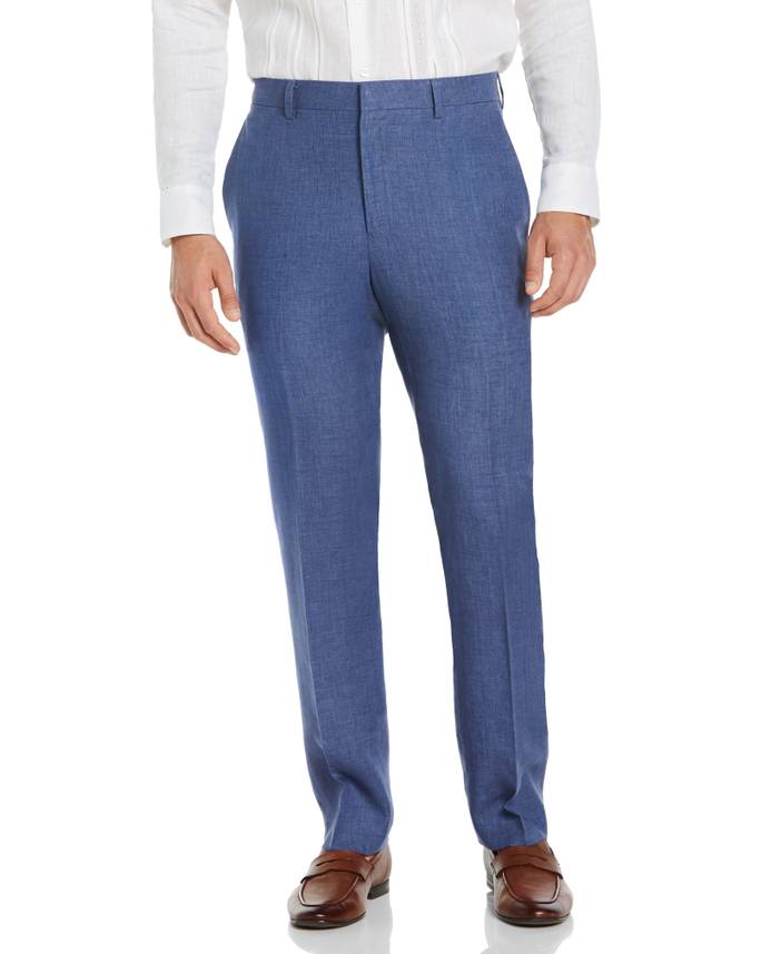 A true essential that will never go out of style. Lightweight and breathable, these sophisticated men's dress pants are cut from 100% Delave linen - a top tier linen with a high-low heathered look and unique texture. This flat front style and straight leg fit creates a modern and sleek silhouette. 100% Linen Tailored Fit Plain Weave Fabrication Weaves In Criss-Cross Patterning For Extra Durability Breathable Delave Linen For A Sophisticated Look Flat Front Design For A Sleek Look Machine Wash Imported | Cubavera Collection Men's Delave Flat Front Pants in Navy Peony Blue, Size 36 x 30, 100% Linen