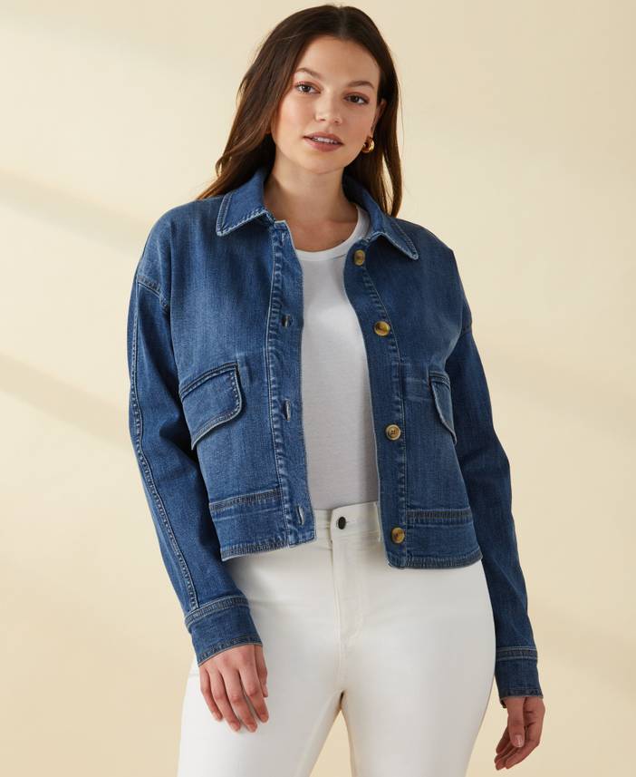An updated take on a casual essential, this Rafaella womenâs denim jacket features a modern oversized, cropped design thatâs perfect for a laidback layered look. The womenâs jean jacket has button closures, with convenient flap - closed pockets at the front to help keep essential items close while youâre on the move. Twill fabrication featuring a hint of added stretch keeps the material lightweight and comfortable to wear all year round. 99% Cotton / 1% Elastane Twill Fabrication Is Lightweight For Coolness And Comfort Lightweight Twill Fabrication Modern Fit Button Front Closure Flap - Closed Front Pockets Long Sleeves With Button Cuffs 22" Length Long Sleeve Machine Wash Imported | Rafaella Women's Cropped Oversized Denim Jacket in Coastal Blue, Size Small, Solid, Cotton/Elastane