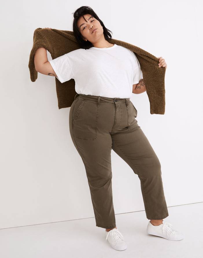 The cut: Engineered for those with an hourglass shape, these straight-legged utility pants have a narrower high waist and a little more room in the hips and thighs. The fabric: Garment-dyed for dimensional color, this sturdy herringbone fabric has a touch of stretch for day-one comfort. Please note: choose your regular size—these jeans were designed for curves, so no need to size up or down.12 1/2" high rise, fitted through the hip and thigh, 18 1/4" straight leg opening, 28 1/2" inseam.98% cotton/2% elastane.Do Well: We partner with the Better Cotton Initiative to improve cotton farming globally.Machine wash.Import.Madewell.com only.