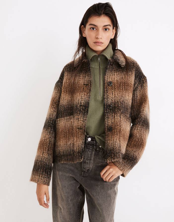A chore coat but make it superwarm. Crafted from weighty-meets-fuzzy fabric in a cool ombré plaid, this button-front jacket has a layering-friendly boxy fit, workwear-inspired drop sleeves and patch pockets. Slightly oversized fit.Body length: 24 1/2".Full-length sleeves.Poly/wool/cotton/acrylic/other fibers.Dry clean.Import.Madewell.com only.