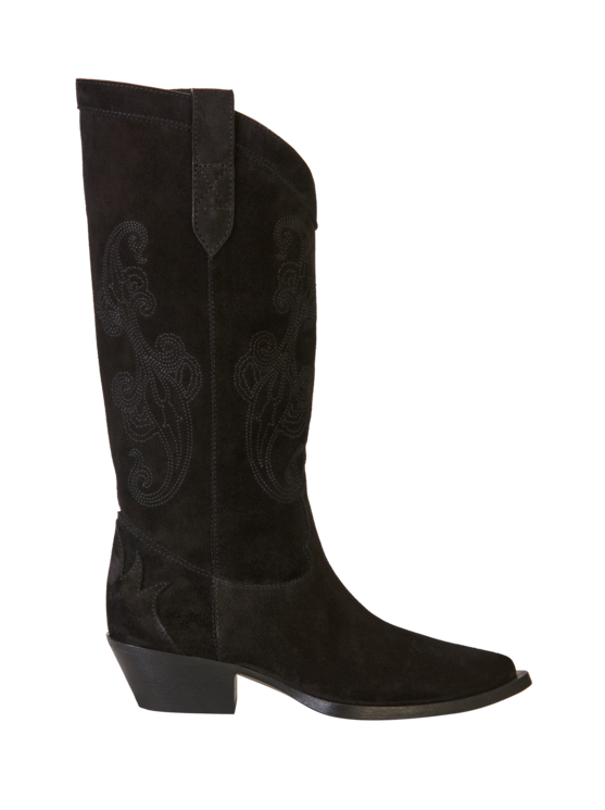 Stiefel aus Veloursleder, bereichert durch ein farblich abgestimmtes, aufgesticktes Paisley-Motiv.