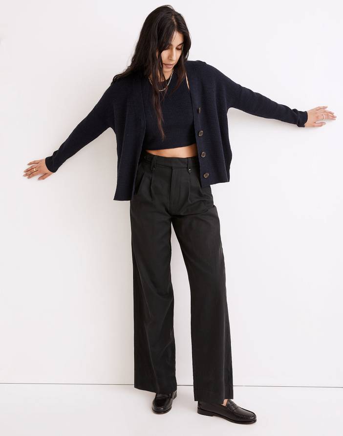 Made of a drapey blend of TENCEL™ lyocell and linen, these breezy wide-leg pants have sailor-inspired details like pleats in front and tabs at the waist. 12" high rise, roomy through hip and thigh, 21" wide leg opening, 29" full-length inseam.Do Well: For each pair made at the Fair Trade Certified™ factory, we contribute to a Community Development Fund managed by the workers.48% TENCEL™ lyocell/33% cotton/19% linen.Machine wash.Import.Select stores.