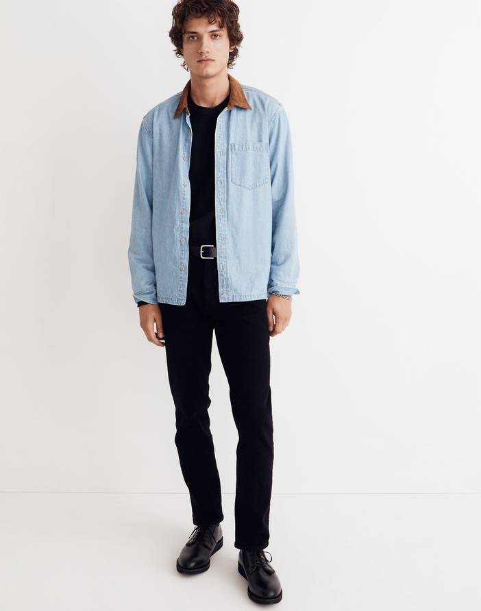 Corduroy-Collar Denim Easy Long-Sleeve Shirt