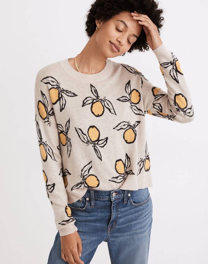 Made of luxe—and lightweight—yarn with a touch of cashmere, this boxy-cropped pullover is covered in knit-right-in tangerines. A sweater that will remind you that vitamin D (and vitamin C) are in your future. Boxy, cropped fit.Body length from high point of shoulder: 22 1/2" (based on size M).Viscose/nylon/poly/cashmere.Machine wash.Import.