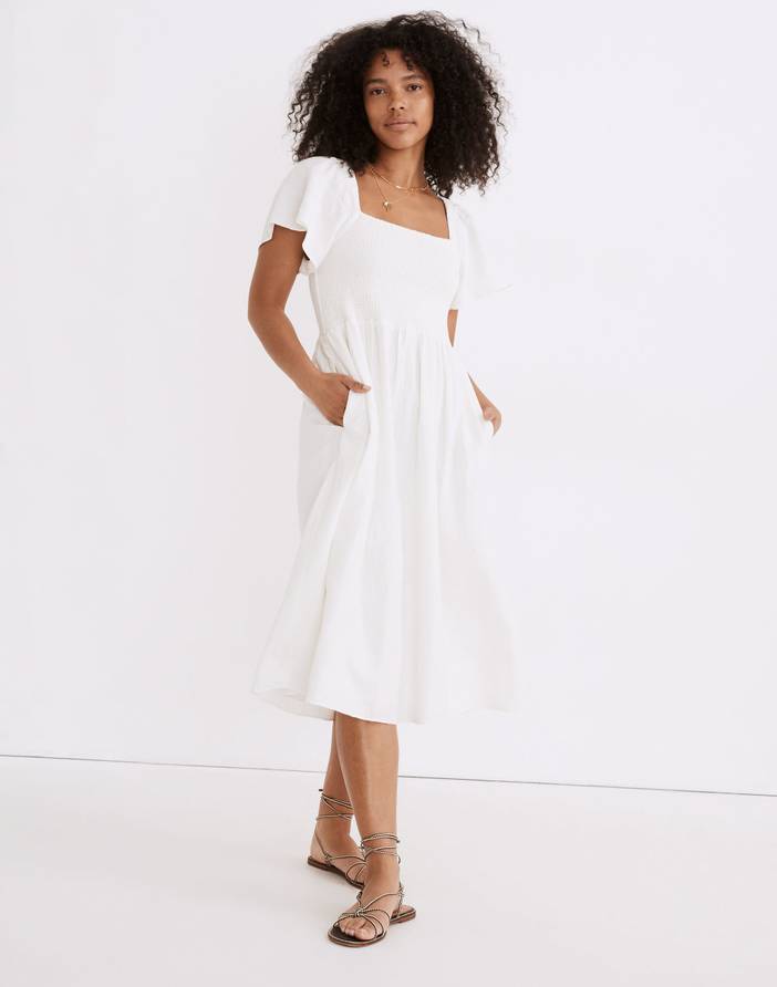 The prettiest way to be comfy in a breezy (and eco-friendly) linen blend, this midi dress has swingy flutter sleeves and a stretchy smocked bodice. Easy on the body but so special you'll want to wear it everywhere you go. Fitted bodice, waisted.Falls 46" from high point of shoulder (based on size M).Do Well: Made of Lenzing™ Ecovero™, a sustainable fabric created with natural fibers and a more eco-friendly process.Linen/Lenzing™ Ecovero™ rayon.Lined.Machine wash.Import.