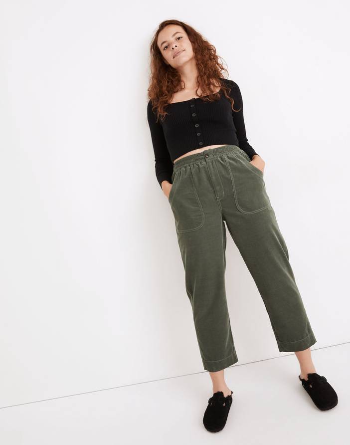 A best-seller reengineered for those with an hourglass shape, these tapered crop pants have a narrower waist with a contoured band, a longer rise (for a rounder booty) and a little extra room at the hips and thighs. A polished alternative to sweats in lightweight corduroy, they're pull-on easy. Please note: choose your regular size—these jeans were designed for curves, so no need to size up or down.13 1/2" high rise, roomy through hip and thigh, 14 1/2" tapered leg opening, 25 1/2" cropped inseam.100% cotton.Do Well: We partner with the Better Cotton Initiative to improve cotton farming globally.Machine wash.Import.Madewell.com only.