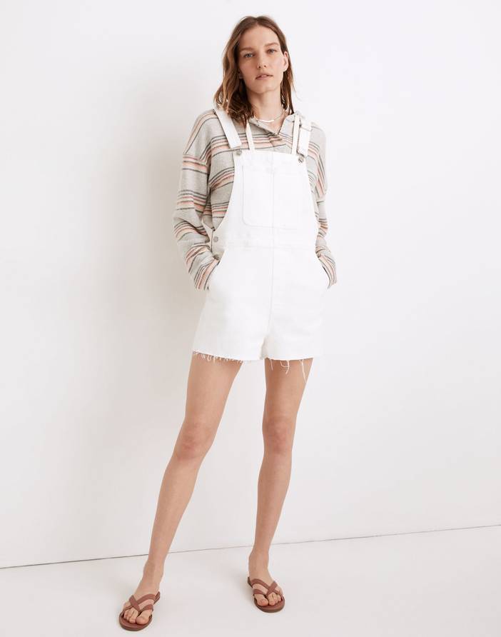 Bib overalls meet jean shorts in a warm-weather version of our favorite one-piece (this pair has a got-'em-in-high-school vibe, cutoff hems and all). Made of our best-selling Heritage Stretch denim that has an old-school look and a touch of give for a perfectly broken-in feel. True to size.Front rise: 11 3/4"; inseam: 2 3/4".Do Well: For each pair made at the Fair Trade Certified™ factory, we contribute to a Community Development Fund managed by the workers.99% cotton/1% spandex Heritage Stretch denim. Machine wash.Import.Madewell.com only.