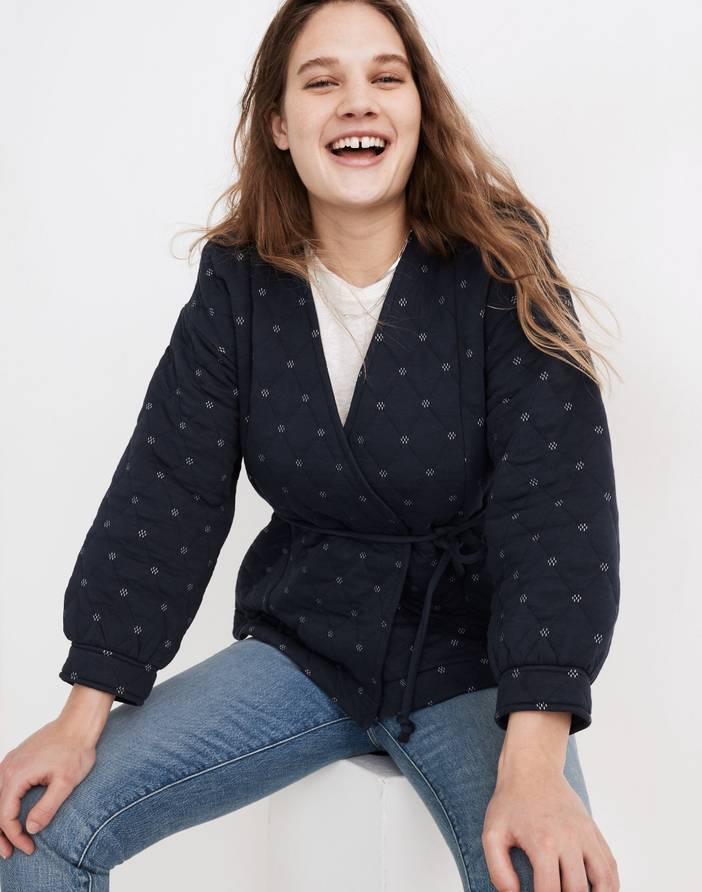 A cozy-at-home wrap jacket made of quilted knit fabric in a mini flower pattern. A three-season layering piece. Relaxed fit.Body length from high point of shoulder: 26 1/2" (based on size M).Do Well: Made from certified organic cotton that is grown without chemical fertilizers and pesticides from untreated, non-genetically modified seeds.Poly/organic cotton.Machine wash.Import.Select stores.