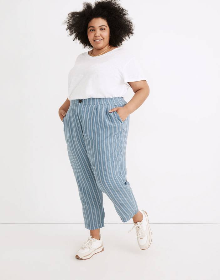 This is how we do sporty-meets-polished: timeless striped track pants—see the elastic waist and subtle front pleats—in a breezy linen blend. 13" high rise, relaxed through hip and thigh, 15" straight leg opening, 25" cropped inseam.Do Well: For each pair made at the Fair Trade Certified™ factory, we contribute to a Community Development Fund managed by the workers.53% linen/47% viscose.Machine wash.Import.Madewell.com only.