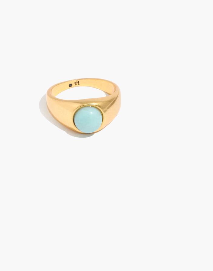 Our take on a classic signet ring, this versatile piece is one to treasure (and wear) every day. P.S. Each semiprecious amazonite stone is hand selected by our designers, so no two are exactly alike. Gold-plated brass, sunstone semiprecious stone, cubic zirconia.Clean your jewelry after each wearing with a soft cloth.Import.