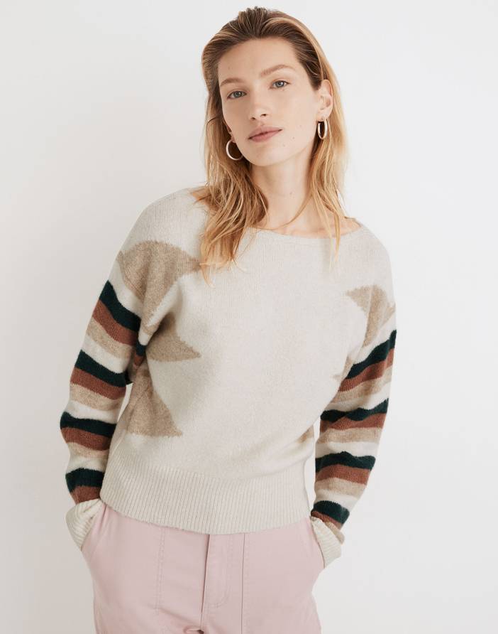 Made of supersoft and lofty yarn, this boatneck sweater has striped sleeves and a bold geometric pattern. With drop shoulders and a smaller-at-the-bottom fit, it has a cool '80s vibe we love. Shrunken cropped fit.Body length from high point of shoulder: 20 1/4" (based on size M).Acrylic/polyamide/wool/alpaca/elastane.Dry clean.Import.