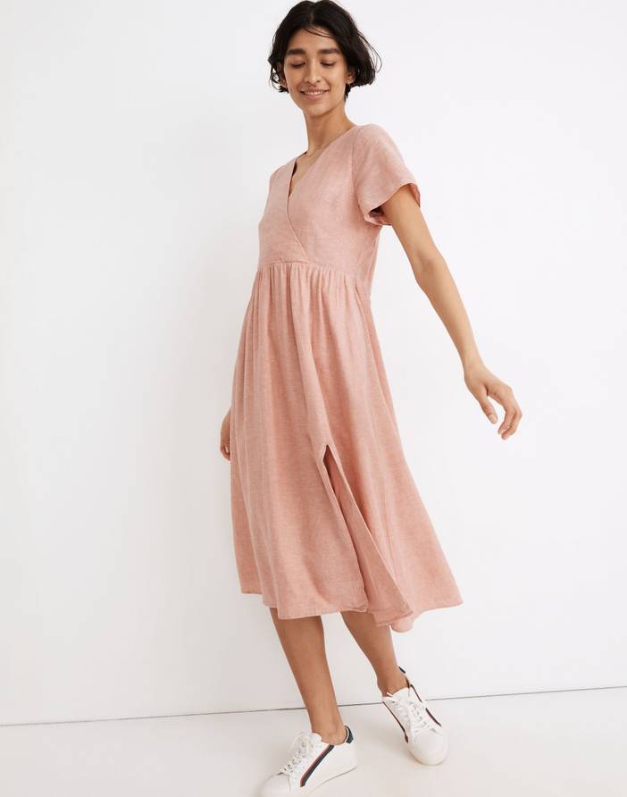 Made of a sustainable linen blend, this midi dress has an easy faux-wrap front. Both flattering and comfy, it's the unicorn you've been looking for. Waisted, easy fit.Falls 48" from high point of shoulder (based on size M).Linen/Lenzing™ Ecovero™ viscose.Do Well: Made of Lenzing™ Ecovero™, a sustainable fabric created with natural fibers and a more eco-friendly process.Pockets.Lined.Machine wash.Import.Madewell.com only.