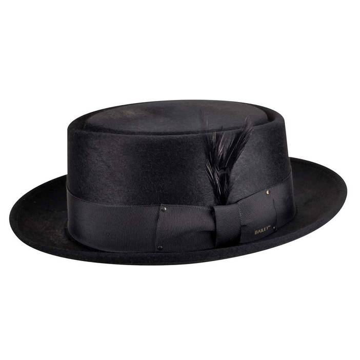 The Jett Pork Pie Hat from Bailey 1922 is the Jazzy standard of the hatting world. It features classic 100% wool felt construction and a sleek jet snap silk finish for that classy look and feel. Its smart casual style makes it a perfect wardrobe addition for any social and worldly individual. This easily-identifiable pork pie features a classic telescope crown with a 2” brim, a classically-trimmed grosgrain band, a comfort sweatband, and a removable feather.