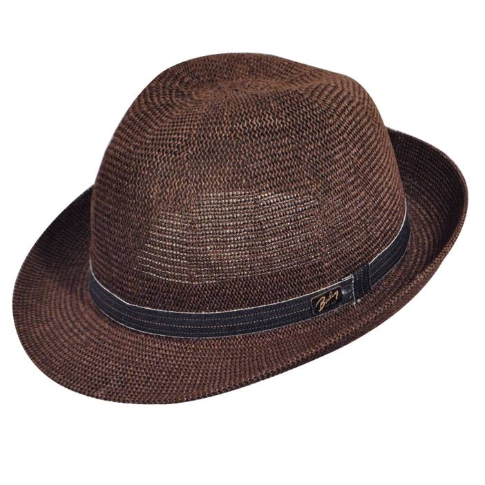 Soft and light in weight, the Bailey 1922 Elliot intricately knits a combination of paper straw and thermo straw in a garter bond that maintains its trilby shape in spite of wear and tear. A slim grosgrain band nicely features a natural Bailey wood chip logo and offers a neat contrast over the breezy paper stitch. A custom Bailey soft polyester sweatband allows this light pre-snapped trilby to sit snugly but comfortably.