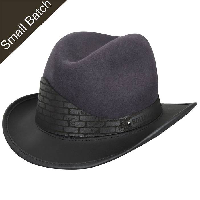 The Bollman by Bollman Hat Company and American Hat Makers is an ode to the early days: to the former whiskey distillery which was the birthplace of Bollman Hat Company and to the brick which adorns the inside and outside of our Adamstown factory. Hand-crafted from a luxurious velvet-like Elite Felt, the Bollman features a laser-etched leather band that features the factory brick wall. The detailing in this leather band is exquisite and one-of-a-kind, adding an artistic edge while the leather brim adds a western ruggedness element to the fedora. The Bollman is fully lined with satin lining and comes in a novelty Bollman Hat Company hatbox for safe storing. Shape: Fedora Crown: Center Dent Brim: 2" Leather brim Fully lined with a satin feel, acetate lining that is branded with an image of the Bollman factory from the 1870s Bollman Small Batch Collection Made in the USA The limited-edition, small-batch style is only available in sizes S, M, L, and XL Due to how the hat is crafted with leather, please size up when ordering
