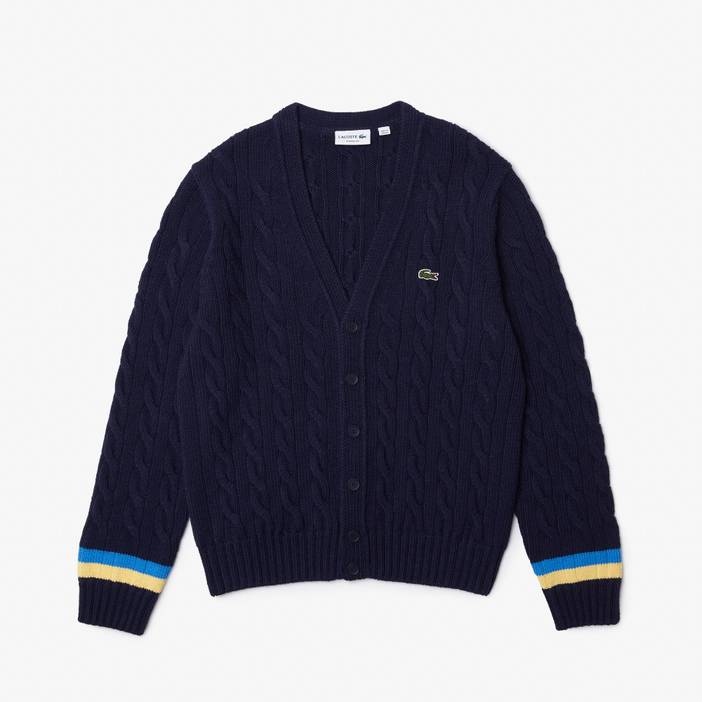 Ein eleganter Cardigan mit Colourblock-Streifen. Umweltbewusst, komfortabel, markant – nicht nur auf dem Tennisplatz.