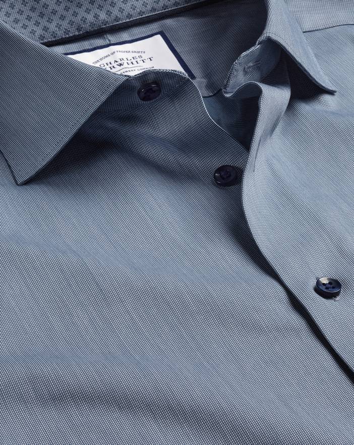 100% cotton, Available in classic, slim and extra slim fit, Printed trim detailing, Semi-spread collar, Classic and slim fit: back pleats, Extra slim fit: back darts, Rounded button cuff with one button, Machine washable - Semi-Cutaway Collar Twill Shirt with Printed Trim - Steel Blue | Men's Charles Tyrwhitt Semi-Cutaway Collar Twill Dress Shirt With Printed Trim - Steel Blue Single Cuff Size Small Cotton