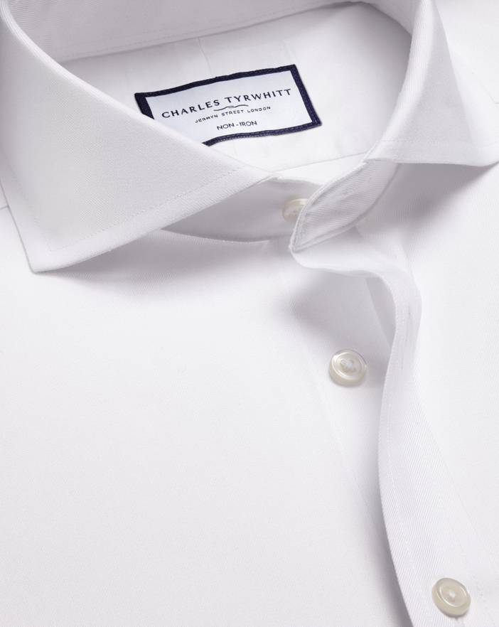 100% cotton, Available in slim and extra slim fit, Non-iron, Modern extreme spread collar, Split yoke for optimal fit and comfort, Slim fit: back pleats for ease of movement, Extra slim fit: streamline back darts, Mitred two-button cuff or square French cuff, Complimentary brass collar stays, Machine washable - Extreme Cutaway Collar Non-Iron Twill Shirt - White | Men's Charles Tyrwhitt Extreme Cutaway Collar Non-Iron Twill Dress Shirt - White Single Cuff Size Small Cotton