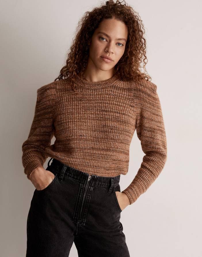 Knit from a soft alpaca-blend yarn, this light and lofty sweater features a crewneck and pinched pleat detailing at the shoulders for an elegant, architectural look. Wear it alone or layer for maximum coziness.Classic fit.Body length from high point of shoulder: 20" (based on size M).Cotton/acrylic/merino wool/polyamide/alpaca.Do Well: by buying cotton products from Madewell, you're supporting our investment in Better Cotton's mission to help cotton communities survive and thrive while protecting and restoring the environment.This product is sourced through a system of mass balance and therefore may not contain Better Cotton.Machine wash.Import.Select stores.
