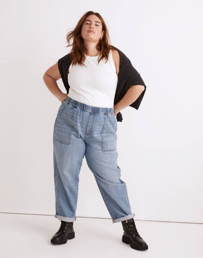The cut: Like a cross between joggers and jeans, this sweats-inspired fit has an elastic waist and comfy straight legs. The fabric: blended with recycled cotton, hemp and lyocell, this zero-stretch denim will feel tight at first but break in juuuust enough to mold to your body. 13 1/4" rise, 14" leg opening, 26 1/2" inseam.72% cotton (21% of which is recycled)/16% hemp/12% lyocell.Do Well: made with recycled cotton that keeps textile waste out of landfills and requires less H2O and energy than conventional cotton.Machine wash.Import.Madewell.com only.