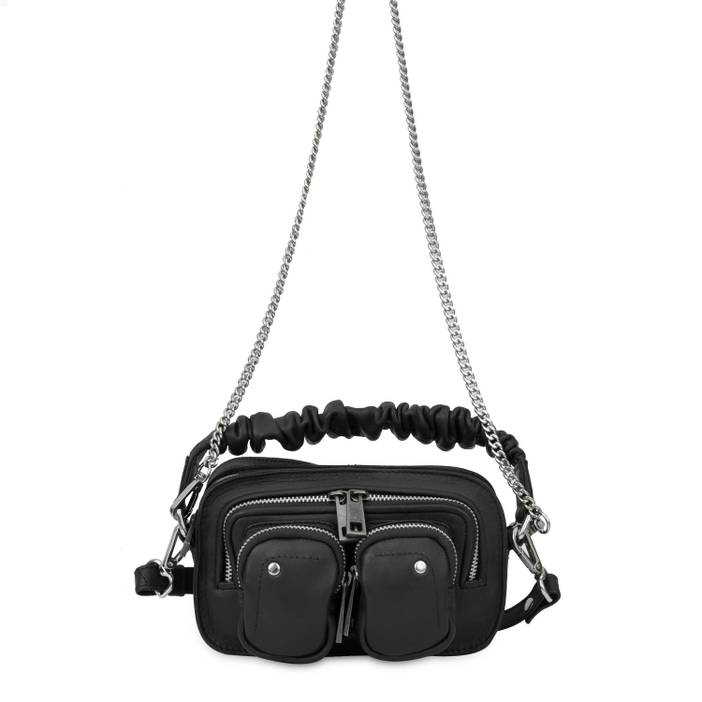 The Helena bag in our silky leather. The bag has a main compartment and an inner pocket with a zip closure. The bag comes with a chain and an adjustable leather strap. These are removable.