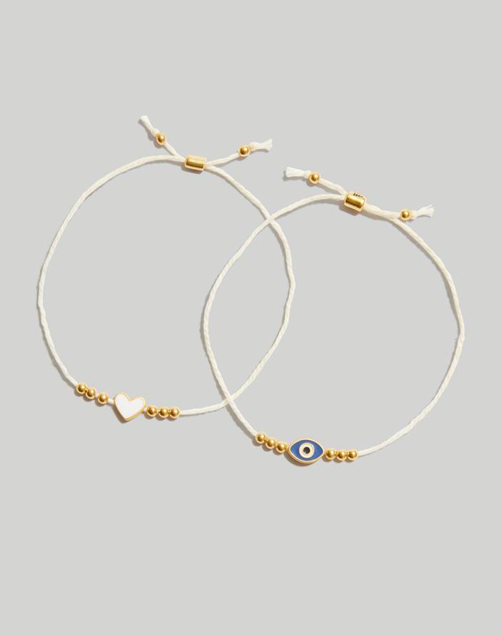 One for you, one for the person who always watches out for you. Strung on cotton cords, this set of two friendship bracelets are more grown-up than the ones you had in junior high but just as fun (one has an enamel heart, the other an evil eye charm). Fully adjustable, they are the perfect gift for BFFs. 9".70% gold-plated brass, 30% recycled brass, enamel, cotton cord, cubic zirconia.Do Well: crafted from recycled factory scrap metals that would otherwise go to waste.Sliding closure.Clean your jewelry after each wearing with a soft cloth.Import.Select stores.