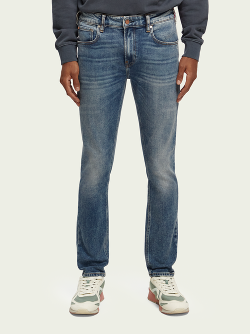 De supersmalle Skim is nauwsluitend van de taille tot de enkel. Dankzij een vleugje elastaan blijft deze skinny stijl de hele dag comfortabel zitten. We hebben deze jeans gewassen in een middelblauwe tint, geaccentueerd met whiskers en afgewerkt met een speciale klinknagel op de muntzak en een gulp met ritssluiting.