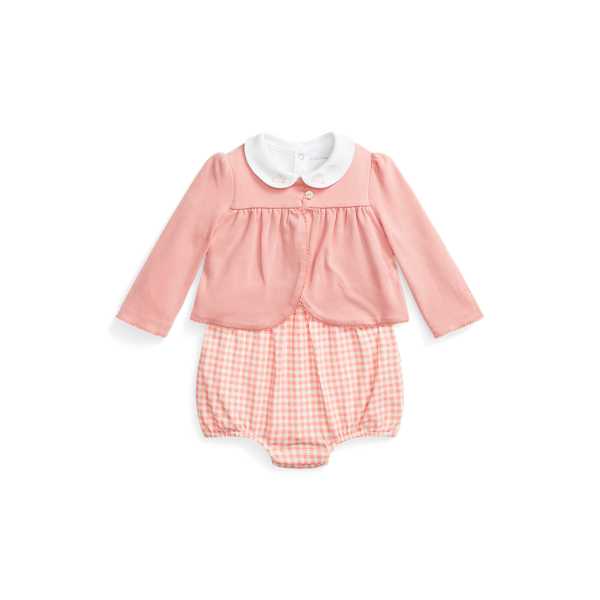 Dieses Set aus weichem Baumwoll-Interlock besteht aus einer Strickjacke mit Picot-Bordüre, einem Gingan-Sommerstrampler mit Rüschenbesatz und einem Babybody mit gestickten Häschen. Ralph Lauren Lauren arbeitet mit Better Cotton™ zusammen, um den weltweiten Baumwollanbau zu verbessern. Better Cotton bildet Landwirte dazu aus, Wasser effizient zu nutzen, die Gesundheit des Bodens und der natürlichen Lebensräume zu schützen, den Einsatz der schädlichsten Chemikalien zu reduzieren und die Grundsätze menschenwürdiger Arbeit umzusetzen.