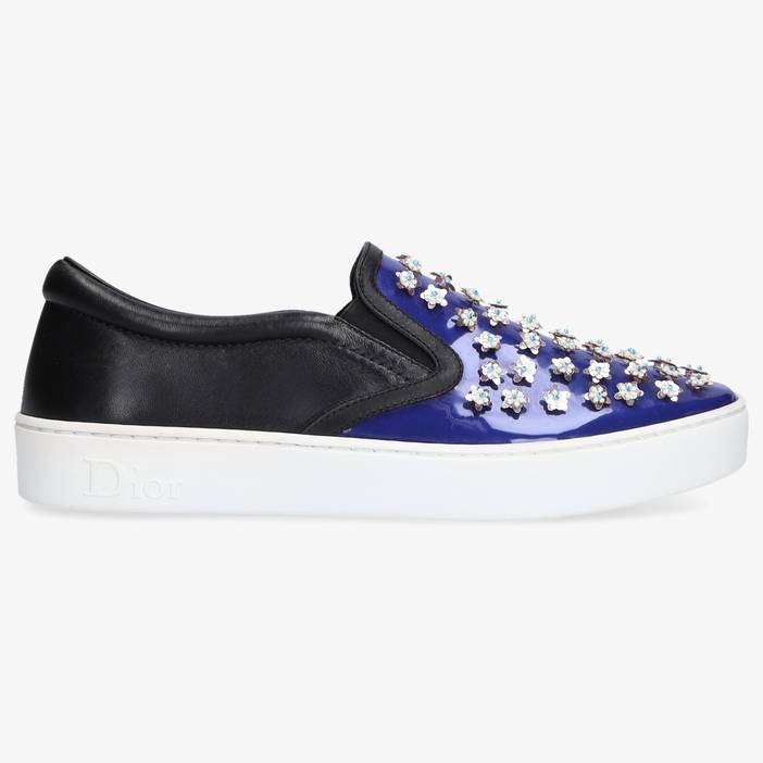 Designer Damen Slip-On Sneaker HAPPY Lackleder dunkelblau Leder schwarz Schmuckverzierung von der exklusiven Luxus-Marke Dior. Details: Obermaterial: Leder, Lack. Verschlussart: Schlupf/Offen. Farbe: schwarz, dunkelblau. Made in: Italy. Lieferzeit: 1-3 Tage. Geschlecht: Damen. Saison: Sommer. Designer: Dior. Größen & Passorm: Size&Fit: Fallen normal aus.