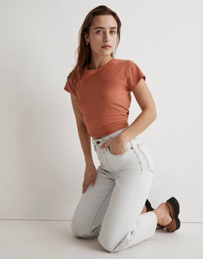 Inspired by the Perfect Vintage Jean, we designed a tee worthy of a '90s supermodel. The fit: slightly shrunken and just the right length to tuck into our high-risers. The fabric: light and gauzy with a well-loved feel. The details: cool flared sleeves, ribbed neck trim.Slightly shrunken fit.Hip length: designed to hit at high hip or below; tuckable.Body length from high point of shoulder: 25" (based on size M).Cotton.Machine wash.Imported.